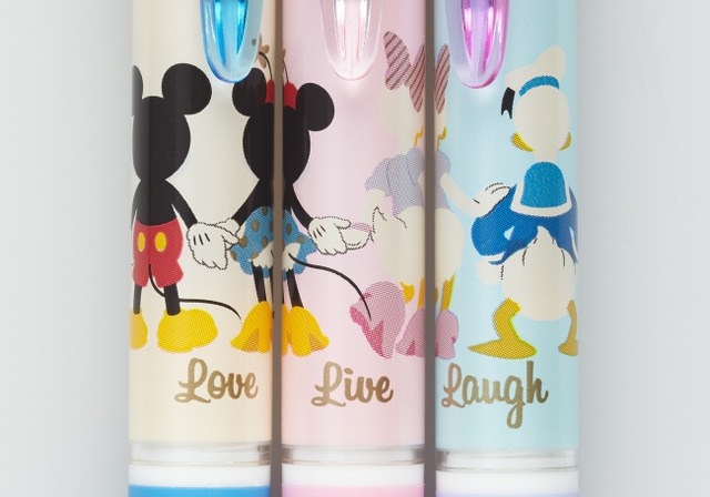 クリップ部を正面にして横に並べると、軸本体に描かれた「ミッキーマウス」、「ミニーマウス」、「デイジーダック」、「ドナルドダック」の4キャラクターが手をつないで並ぶデザインが表れるさりげない演出を施しています。