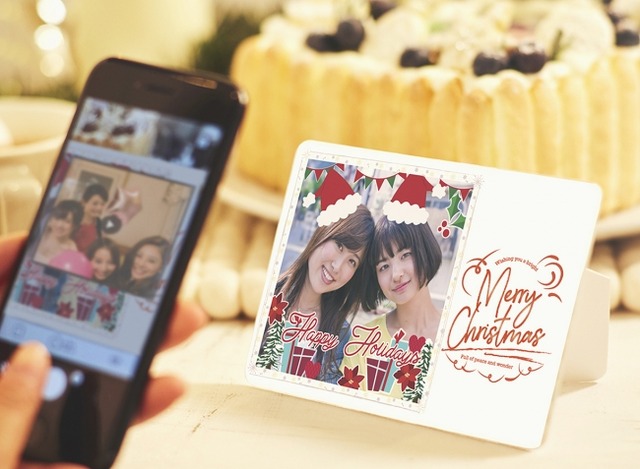 お手元に届いたピクトケーキやクリスマスカードの写真にスマホをかざすと写真が動きだします(フォトカードはケーキと同梱されておらず、後日お届けとなります)