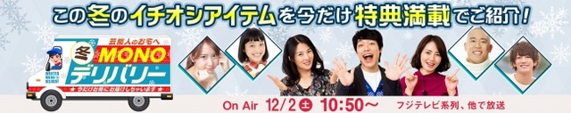 株式会社ディノス・セシール(本社:東京都中野区)は、テレビショッピングで大ヒットした、食品や寝具などを厳選し、お得な価格や特典で紹介するフジテレビ系特別番組『芸能人のお宅へ 冬MONOデリバリー~今だけお得にお届けしちゃいます~』を、12月2日(土)10時50分より放送します。今回は、今年の夏、秋と放送し好評をいただいた“芸能人のお宅訪問シリーズ”の第3弾にあたる、年末スペシャル番組です。