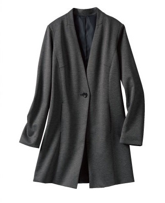 ノーカラーですっきり見せてロング丈で縦ラインを強調。ウエストがシェイプされた美しいシルエット。