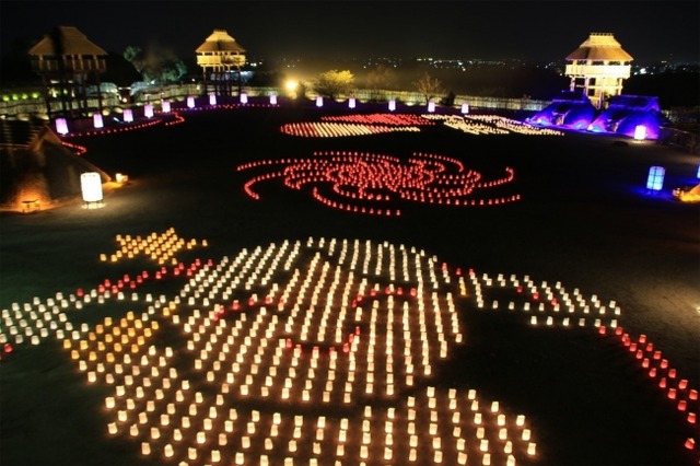 弥生時代の復元された環濠集落をライトアップし、キャンドルやかがり火が暖かな光を放ちます。6回目となる今年の「吉野ヶ里 光の響」では昨年好評を博した「キャンドルの地上絵」が今年も登場。キャンドルの揺らめく灯りで、公園マスコットキャラクターや復元建物などをメイン会場「南内郭」に作ります。