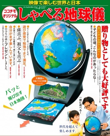ココチモオリジナル『しゃべる地球儀パーフェクトグローブ・ネオビジョン』は、10,000シーンを超える映像と、15,000を超える音声解説付きの未来型地球儀。子供たちへの知育教材としてはもちろん、大人の知的なインテリア玩具としても傑作です。ココチモでしか手に入らない7インチ大画面モニターは見やすいと大好評です。