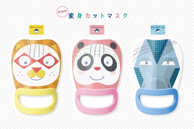 子どもの前髪を切ってあげたくても、他人の髪を切ったことがない初心者マークのパパやママが、動き回る子どもの髪を切るのは至難の技。そこで、理美容師のプロの目線と、たくさんのパパやママの生の声を反映して誕生したアイテムが、可愛く&楽しく変身できる「変身カットマスク」です。これを顔にあてることで、子どもはフォトプロップスのように楽しみながら、親も安全・簡単・快適に、前髪カットに挑戦できます。今回は「ストレートカット」に続き、「ラウンドカット」「アシンメトリーカット」に挑戦できるデザインが新登場しました。