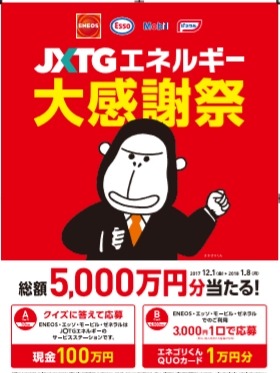 JXTGエネルギー株式会社は、全国のENEOS・エッソ・モービル・ゼネラルのサービスステーション約13,000カ所において、「JXTGエネルギー大感謝祭~総額5,000万円分が当たる!~」を実施しています。