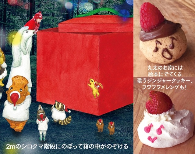 絵本の原画が間近で見られるだけでなく、絵本の一場面が森の中に再現。シロクマのイラストが約2mの階段になっていて、のぼるとプレゼントの中身がのぞける仕掛けや、絵本の中の可愛いお菓子も登場。夜にはイルミネーションで森が輝きます。