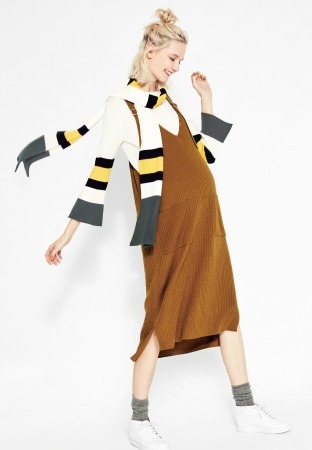 サロペットスカートは肩紐までニットでつくることで着心地の良さとファッション性を高めています。裾に斜めのスリットを入れて、スポーティーに仕上げています。ポップなカラー配色のセーターは効き色を絞ることでスタイリングに取り入れやすく、フレア袖がアクセントになっています。