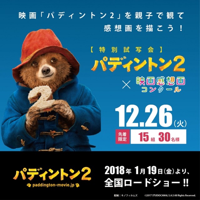 「映画感想画コンクール」の開催エリアの拡大を記念して、ロングセラー児童小説を実写映画化した「パディントン」の続編映画「パディントン2」 (2018年1月19日全国公開)の親子で参加できる試写会および映画感想画イベントを12月26日(火)に開催いたします。イベント当日は、Instagramでフォロワー数54万5千人を誇る大人気の双子キッズモデルりんかちゃん&あんなちゃんゲスト参加され、映画「パディントン2」を鑑賞し、映画感想画を描いて頂きます。