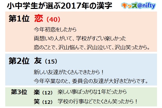 ○「小中学生が選ぶ2017年の漢字」結果発表 http://kids.nifty.com/report/2017kanji/