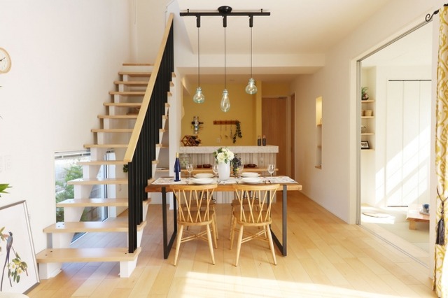 家族が寛ぐリビングに圧迫感を感じさせないシースルー階段やハイオープンキッチンにカフェカウンターを