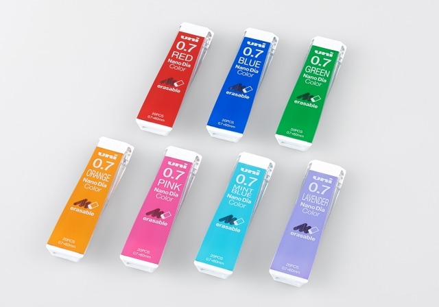 三菱鉛筆株式会社(本社:東京都品川区 社長:数原英一郎)は、消しゴムできれいに消せるカラーシャープ替芯『ユニ ナノダイヤ カラー』(各200円+消費税/20本入り)の芯径0.7mm(レッド、ブルー)に新色5色(ピンク、オレンジ、グリーン、ミントブルー、ラベンダー)を追加し全7色のラインアップで12月28日(木)から発売いたします。