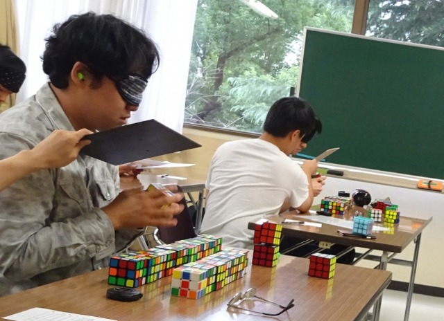 複数個のルービックキューブを目隠しをして揃える競技です。各自揃える個数を決め、スクランブルされた(色が揃っていない)全てのルービックキューブの配置を覚えます。続いて、目隠しをして全て一気に揃えていきます。制限時間は60分。
