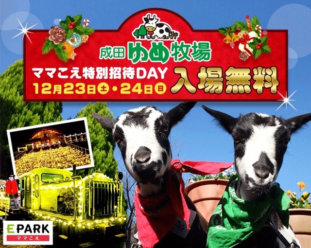 株式会社EPARKママこえ(本社:東京都港区、代表取締役:新田悟郎)は初の試みとして、2日間限定で成田ゆめ牧場を無料で楽しむことができる「EPARKママこえ特別ご招待DAY」を2017年12月23日(土)~2017年12月24日(日)に開催致します。