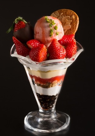 あまおうの酸味とカスタードクリームの甘み、冷たいいちごのシャーベットと温かいカスタードクリームが絶妙な組み合わせです。