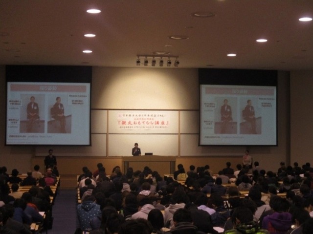 日本経済大学 福岡キャンパス(所在地:福岡県太宰府市 学長:都築明寿香)は、12月15日(金)鴻臚館大講義室において経済学部商学科エアラインマネジメントコースの開設1周年にあわせて日本航空株式会社(本社:東京都品川区、社長:植木 義晴、以下「JAL」)より講師を招き、地域連携公開講座「観光おもてなし講座」を開催いたしました。