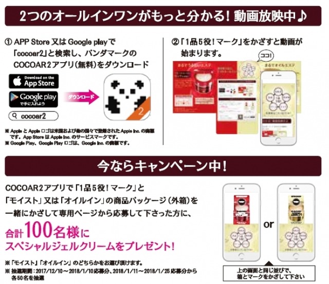 スターティアラボ株式会社(本社:東京都新宿区、代表:北村健一)は、資生堂が販売しているスキンケアブランド「AQUALABEL(アクアレーベル)」のオールインワンのプロモーションに当社開発のARアプリ「COCOAR2」が採用されたことをお知らせいたします。COCOAR2を用いて、サンプル品が入っている指定の台紙に表示されている「1品5役!」マークをかざすと商品PR動画が閲覧される仕組みになっております。更に、「1品5役!」マークとAQUALABELの「モイスト」又は「オイルイン」の商品パッケージを一緒にかざすと、合計100名様にスペシャルジェルクリームが当たるモニターキャンペーン応募ページが表示される仕組みになっております。尚、サンプル品(サンプル品が入っている指定の台紙)はブランドサイトから(URL:https://www.shiseido.co.jp/aqua/)申込みされた方5万名に抽選で郵送され、キャンペーン応募期間は来年1月25日までを予定しております。