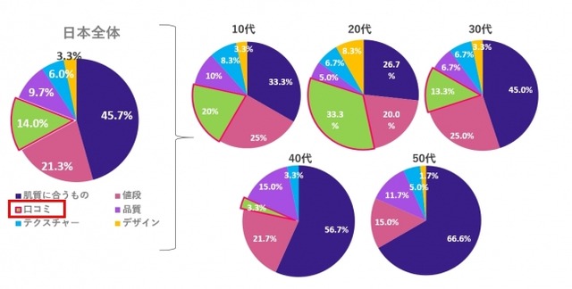 さらに、どの国においても『口コミ』を重視して化粧品を選ぶ女性は多く、年齢別に比較すると、若い世代ほど『口コミ』を重視して化粧品を選んでいるということが分かりました。