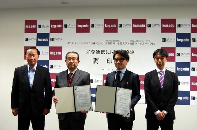 2017年12月4日(月)に調印式が開催され、京都情報大学院大学から寺下陽一副学長と上田治文教授、グラビス・アーキテクツ社からは古見彰里代表取締役、金英樹ディレクターが参加し、共同研究のビジョンについて発表をしました。その後、寺下副学長と古見代表取締役が協定書に署名することで正式に調印を交わす事となりました。