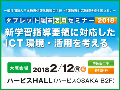 一般社団法人日本教育情報化振興会では、情報教育対応教員研修全国セミナー「タブレット端末活用セミナー2018」を、2018年2月12日(月・祝)にハービスHALL(ハービスOSAKA B2F)にて開催いたします。