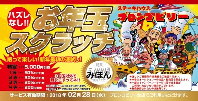 株式会社ブロンコビリー(本社:愛知県名古屋市 代表取締役社長:竹市 克弘)は、2018年1月1日(月)から限定で、期間内でお食事をされたお客様に、次回のお食事を更に楽しんで頂けるように『お年玉スクラッチフェア』を、ブロンコビリー119店舗で実施します。
