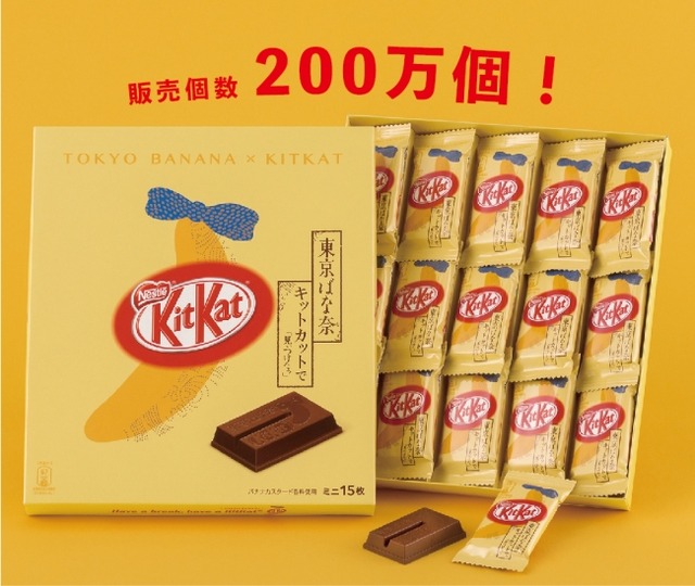 2017年11月15日~2018年1月9日に東京駅一番街「東京おかしランド」で先行販売した『東京ばな奈 キットカットで「見ぃつけたっ」』。本商品は、東京ばな奈とキットカットが“東京を訪れる人のもっともっと大好きな新東京みやげ”をテーマに開発したコラボレーション商品です。発売前から多くの話題を呼び、1店舗のみの取り扱いにもかかわらず、おかげさまで発売を開始して8週間(2017/11/15~2018/1/3)で販売個数200万個を達成しました。実際に食べた方からは、「キットカットと東京ばな奈を一緒に食べてるみたいで幸せ」「バナナが刻印されてて可愛い」などの多くの反響をいただいています。