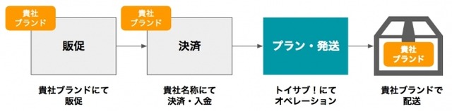 ホワイトラベルとも呼ばれる、サービスのブランドのみを変え同様のサービスを提供するビジネスモデルです。提携企業様のブランドでサービスを提供し、お客さま毎のプラン作成、発送、在庫管理等の裏方作業を弊社で行うことで提携を行います。以下の図に概念を記載します。サービスプロセスにおいてどのプロセスをどの会社が行うかによりビジネスモデルが異なり、提携企業様毎に個別のプロセスを相談させていただきます。