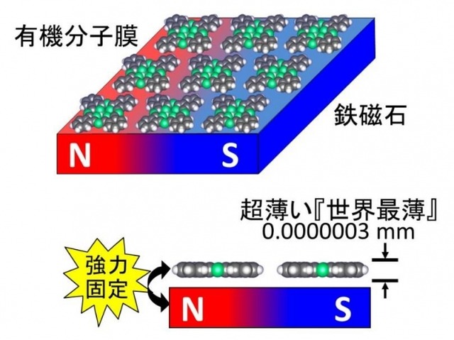 ところが、鉄磁石の力をかりると、この分子の動きがピタッととまり、非常に安定な分子膜となることを発見しました。しかも、その分子膜の厚さを0.0000003mmという、現在使われている分子膜の1000分の1以下にまで薄くすることに成功しました!