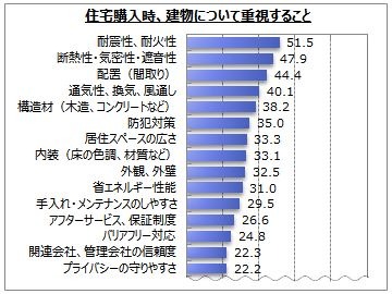 今後家を購入する場合、建物について重視する点を全員に聞いたところ、「耐震性、耐火性」「断熱性・気密性・遮音性」「配置(間取り)」「通気性、換気、風通し」「構造材」が4~5割となっています。「アフターサービス、保証制度」は26.6%です。