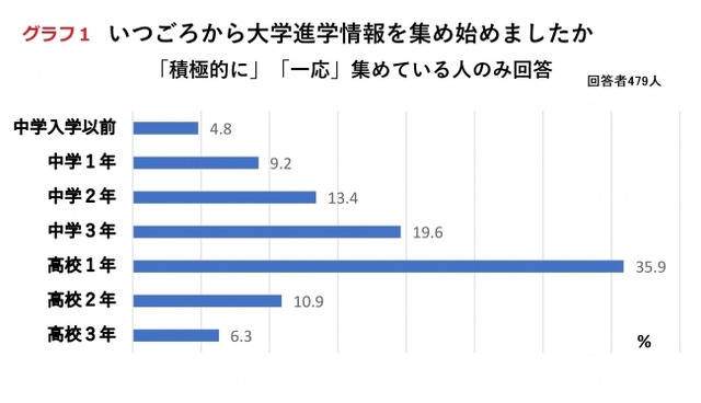 大学進学に関する情報は「積極的に集めている」が188人(26.3%)、「一応集めている」が277人(38.8%)と半数以上。「積極的に」「一応」集めている人のうち、高校1年から集め始めた人が172人(35.9%)で学年別では最多ですが、中学生から集めた人は計131人(42.2%)、中学入学以前からという人も23人(4.8%)で、半数が高校入学前に大学の情報を集め始めています(グラフ1、回答者479人)。
