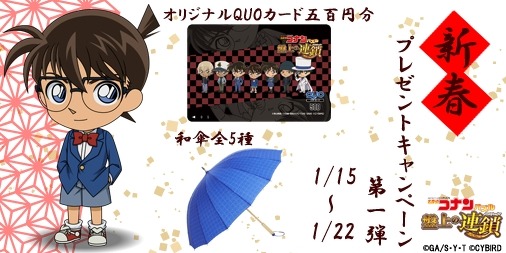 株式会社サイバード(本社:東京都渋谷区、代表取締役社長 内海 州史)は、現在事前登録実施中の、名探偵コナンの新作スマートフォン向けゲーム『名探偵コナンパズル 盤上の連鎖(クロスチェイン)』の公式 LINE@(https://line.me/R/ti/p/EwvopGrtrK)にて、豪華グッズを5週連続でプレゼントする新春キャンペーンを、本日1月15日(月)を皮切りに実施します。新春プレゼントキャンペーン第1弾では、キャラクターをイメージした和傘や、オリジナルデザインのQUOカードなどの豪華グッズを、総勢47名様プレゼントします。