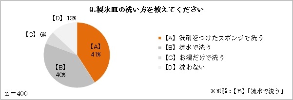 他の食器と同様に、「洗剤をつけたスポンジで製氷皿を洗う」人が最も多く41%(164人)という結果になりました。その一方で、製氷皿を「洗わない」という回答も13%(52人)ありました。正しい使用方法となる、「流水で洗う」と答えた人は40%(159人)と半数以下に留まりました。