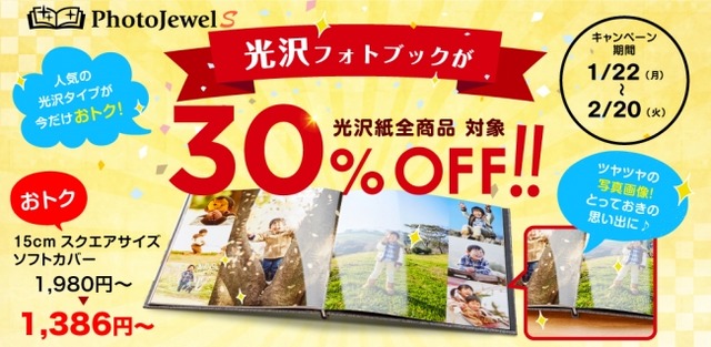 PhotoJewel Sで人気のある光沢紙のフォトブック全品が30%となるキャンペーンをスタートします。