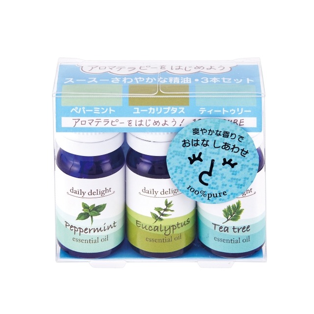 「デイリーディライト スースーさわやかな精油3本セット」は、花粉でつらい方が少しでも楽になれるようなスースー系の精油(エッセンシャルオイル)をセレクトしています。