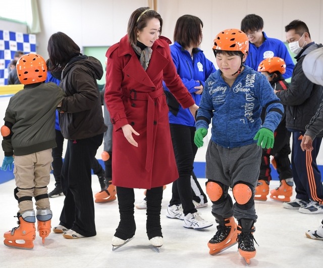 続いて、体育館に仮設された樹脂製のリンクで小学部の児童10人がスケート体験を行いました。ほとんどの児童がスケート初体験でしたが、教職員に支えられながら一歩一歩リンクに踏みだし、一周できると笑顔がこぼれました。キャシーさんは、子どもたちの手を取り「上手!すごいね!」などと声をかけました。