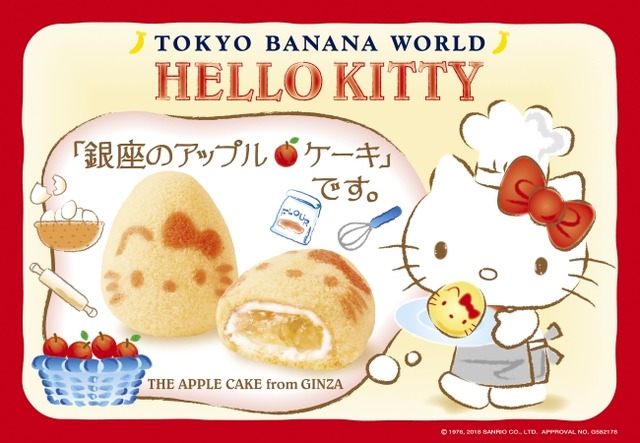『「銀座のアップルケーキ」です。』には、東京ばな奈ワールドの技とハローキティらしいリンゴの魅力がいっぱいつまっています。まわりは、東京ばな奈の永年の技をいかした、ふわふわ柔らかいスポンジケーキ。スポンジ生地には、ハローキティがかわいく描かれています。中は、リンゴのジューシーなおいしさをことこと煮詰めたアップル・コンフィチュール(ジャム)。爽やかな甘酸っぱさを引き立てるため、コンフィチュールは、滑らかなミルククリームに包んでいます。東京ばな奈のやさしさとハローキティらしいリンゴのおいしさが一緒になった、ふわふわぷるぷる食感をお楽しみください。