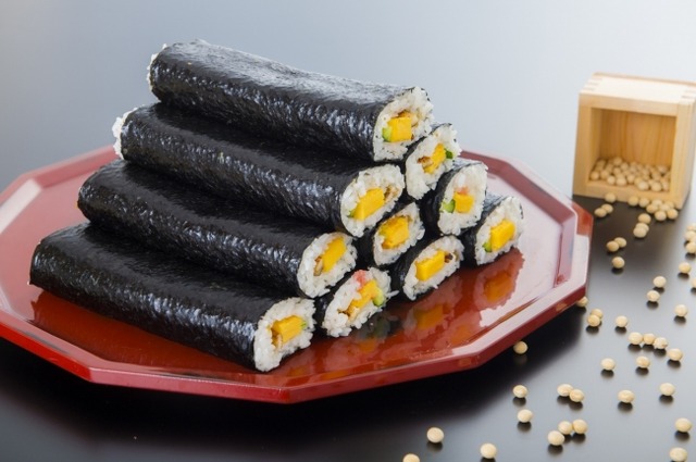 「恵方巻き」は2種類を販売。寿司処「橘」では、七福神にちなんで名物自家製穴子などの具材を7種類巻き込んだ豪華恵方巻きを。「デリカテッセンホテル日航熊本」では、お子様も食べきれる小ぶりなサイズでご用意しました。また、ケーキショップ「ラ・パティシエール」では、恵方巻きに見立てた抹茶ロールケーキと苺ロールケーキの2本組を販売いたします。