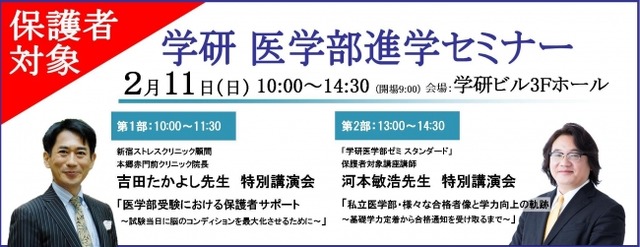 当日は、受験生の脳機能を専門に扱う本郷赤門前クリニックの院長を務め、文化人タレントとしても活躍中の吉田たかよし先生や「学研医学部ゼミ スタンダード」保護者対象講座講師の河本敏浩先生による講演会に加え、河本敏浩先生個別相談会を実施します。