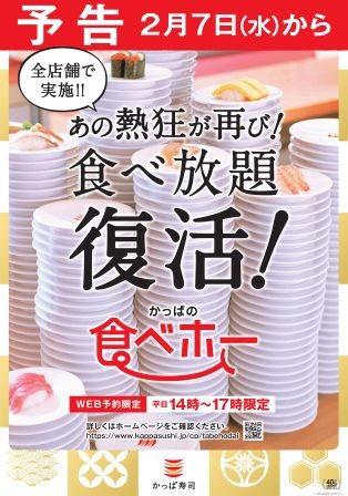 コロワイドグループのかっぱ寿司(カッパ・クリエイト(株) 本社:神奈川県横浜市 代表取締役社長 大野健一)は、2018年2月7日(水)より、昨年より大変ご好評いただいている人気イベント『食べホー』が全店舗で復活いたします。