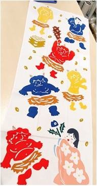 手染めの手ぬぐいです。福娘が鬼を退治している絵柄です。