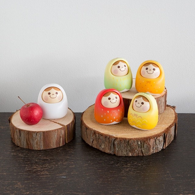 Strawberry、Pine、Green apple、Mikanのフルーツラインと、付属のオリジナルシールで自由にアレンジすることができるWHITE DECOの5種類がオリジナルのうなずきんです。