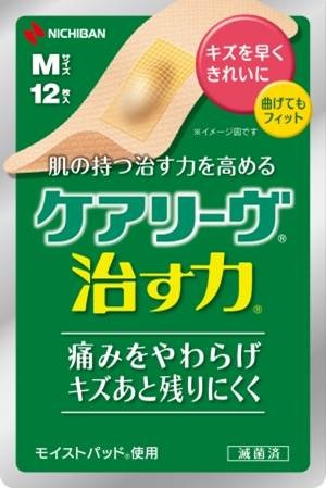 「ケアリーヴTM治す力TM」は、モイストヒーリング(湿潤療法)で痛みを軽減し、キズを早くきれいに治す絆創膏です。パッド部分にハイドロコロイド素材のモイストパッドTMを採用しました。モイストパッドは、キズぐちから出る浸出液を吸収して白くふくらむことで湿潤環境を作り、肌の持つ治す力を高め、キズを早くきれいに治します。テープ部分には、透湿性と伸縮性に富む高密度ウレタン不織布を使用。皮膚が白くふやけにくく、関節部などの動きにもしっかりフィットします。