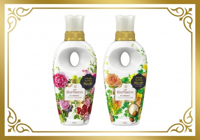 『レノアハピネス』は、華やかな香りをもたらすプレミアムアロマと、香りを持続させるパフュームカプセルを配合し、心地よい強さで、香水よりも香りが長続きする柔軟剤シリーズです。