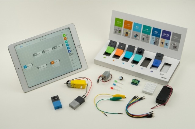 今回の「MESHひらめきラボセット」では、MESHに加えて、MESHとつなぐことができるモーターやケーブルなどと、ガイドコンテンツをセットにしました。ガイドコンテンツを通じて、MESHを使ってプログラミングを行う方法や、モーターなどを動かす仕組みなどを理解しながら進めていくことができます。