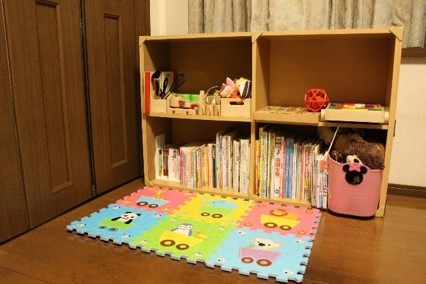 (おもちゃごとにコーナー分けした時の様子 手前:ままごとコーナー/奥:ぬいぐるみコーナー)
