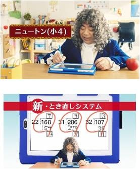 ニュートン(出川さん)が自宅で、タブレット教材<チャレンジタッチ>で勉強中です。問題を間違えた時、「とき直しボタン」が現れます。「とき直しシステム」で、間違えた問題にもう一度取り組み、見事正解したニュートンは、つまずきを残さない「とき直しシステム」は「学びの大発見」だと喜びます。