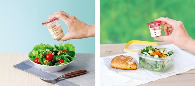 『マイドレッシングカップ』は、サラダランチ用にドレッシングを作ってそのまま持ち運べる容器です。容量は市販の使い切りサイズのドレッシングと同じ25mL、オリジナルレシピ(ドレッシング10種)付きで色々な味が簡単に作れます。フタの色がレッド、イエローの2種からお選びいただけます。