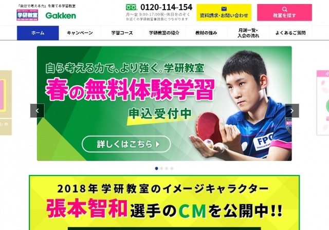 学研教室は、1980年に創設され、子どもたちが自信を持つことと、学ぶ喜びを感じることを願って、全国に展開している学習教室です。2018年より、学研教室の在籍会員である卓球日本代表・張本智和選手をイメージキャラクターに起用。現在、張本選手が出演するテレビCMも公開中です。