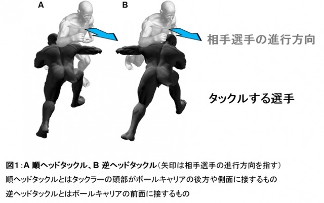 タックルした選手の頭部位置が相手選手の進行方向を遮るように衝突した場合、脳振盪をはじめとした頭頚部外傷の発生頻度が30倍高いことを明らかにした