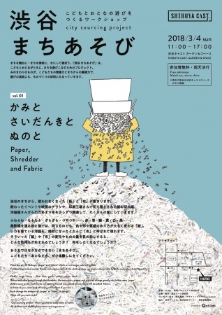 2018年3月4日(日)、クリエイター専用シェアオフィスco-lab(コーラボ)を企画運営する春蒔プロジェクト株式会社(東京都渋谷区 代表取締役:田中陽明)は、深沢アート研究所の山添joseph勇氏と共同して、クリエイティブ活動の拠点となることを目指した複合施設・渋谷キャストの広場「渋谷キャスト ガーデン」と多目的スペース「渋谷キャスト スペース」にて、こどもとおとなのあそびをつくるワークショップ『渋谷 まちあそび vol.1 かみと さいだんきと ぬのと』を開催いたします。