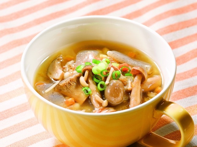 きのこ3種類の他、7種の具材(玉ねぎ、大根、にんじん、ごぼう、こんにゃく、鶏肉、はだか麦)が入っており、風邪が流行っているこの季節、風邪に負けない身体作りに一役買います。また、食物繊維(1食あたり1.95g)も一緒に摂ることができますので、野菜不足を感じている女性や便秘に悩んでいる女性の皆さんにもおすすめです。