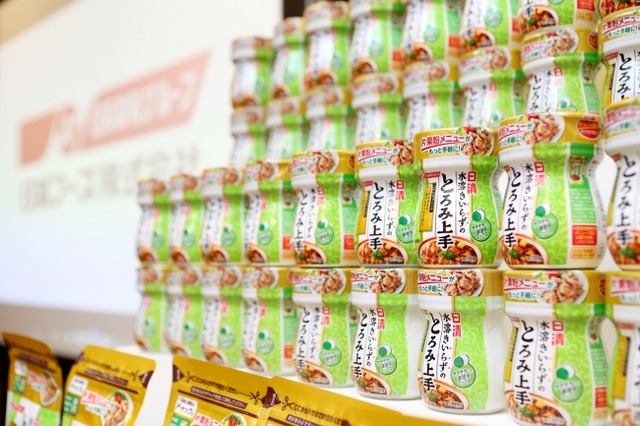 今回の目玉製品は「日清 水溶きいらずのとろみ上手」。「粉が舞い、キッチンが汚れてしまう」「保管しにくい包装形態」等の従来の片栗粉への不満を解消し、「とろみづけ」「から揚げ」が手軽にできる調理用ミックスです。